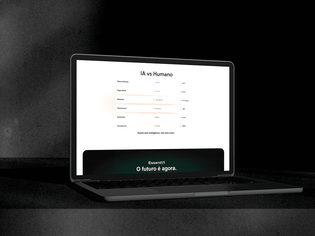 A Essent.IA cria soluções de automação inteligente para diversos setores. O desafio central foi construir um site institucional que transmitisse a robustez de uma marca que escala negócios através de dados, estabelecendo um visual que comunicasse tecnologia de ponta com clareza absoluta.